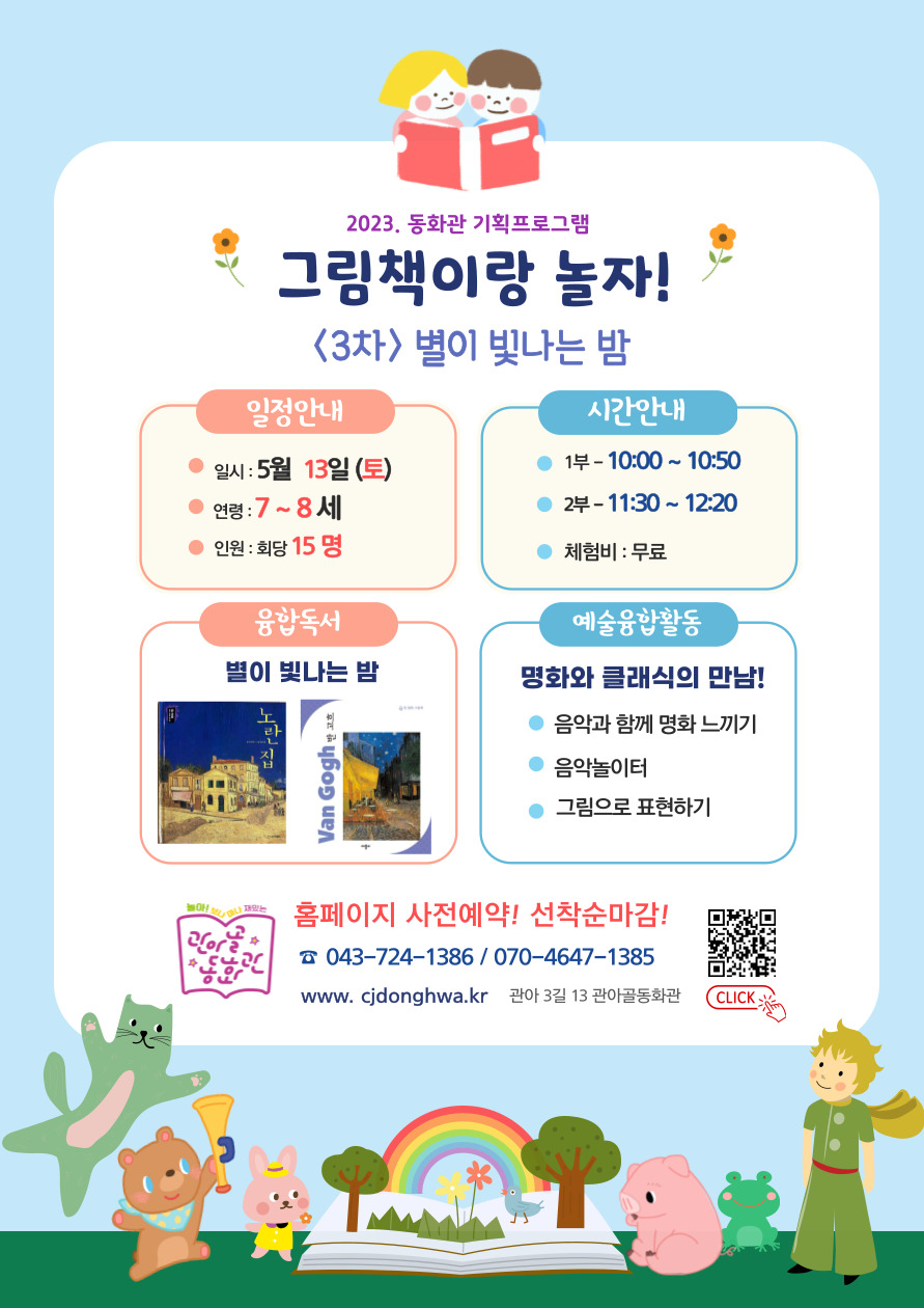 2023. 동화관기획행사 '그림책이랑 놀자!' <3차-별이 빛나는 밤> 작성자 관리자 등록일자 2023년 5월 11일 17시 32분 0초 조회 324 2023. 동화관기획행사 "그림책이랑 놀자~!"★ 프로그램 소개 동화관에서 다양한 책놀이를 통해 독서와 친해지기!!다양한 예술 활동으로 소극적 책 읽기에서 적극적 책 읽기를 통해상상력과 꿈을 키울 수 있는 시간을 경험하기!★ 체험비 : 무료 ★ 신청방법 : 온라인 사전예약! *선착순 접수 마감! 그림책이랑-놀자2-001.jpg [ Size : 246.74KB, Down : 182 ] 미리보기 다운로드 목록보기